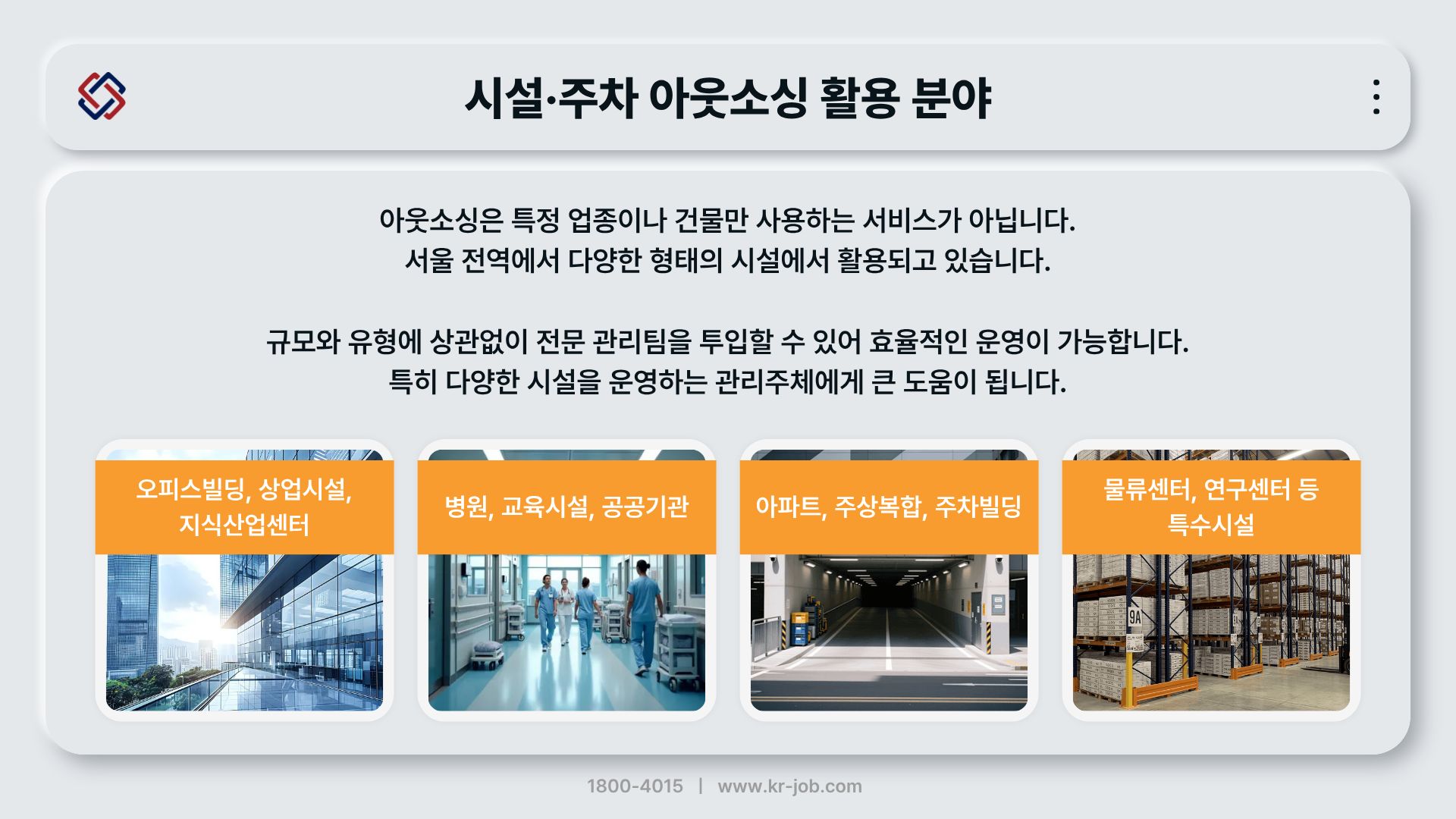 케이알잡(KR-JOB)은 서울 지역 시설 및 주차 관리를 위한 체계적인 인력 운영 시스템을 보유하고 있습니다.