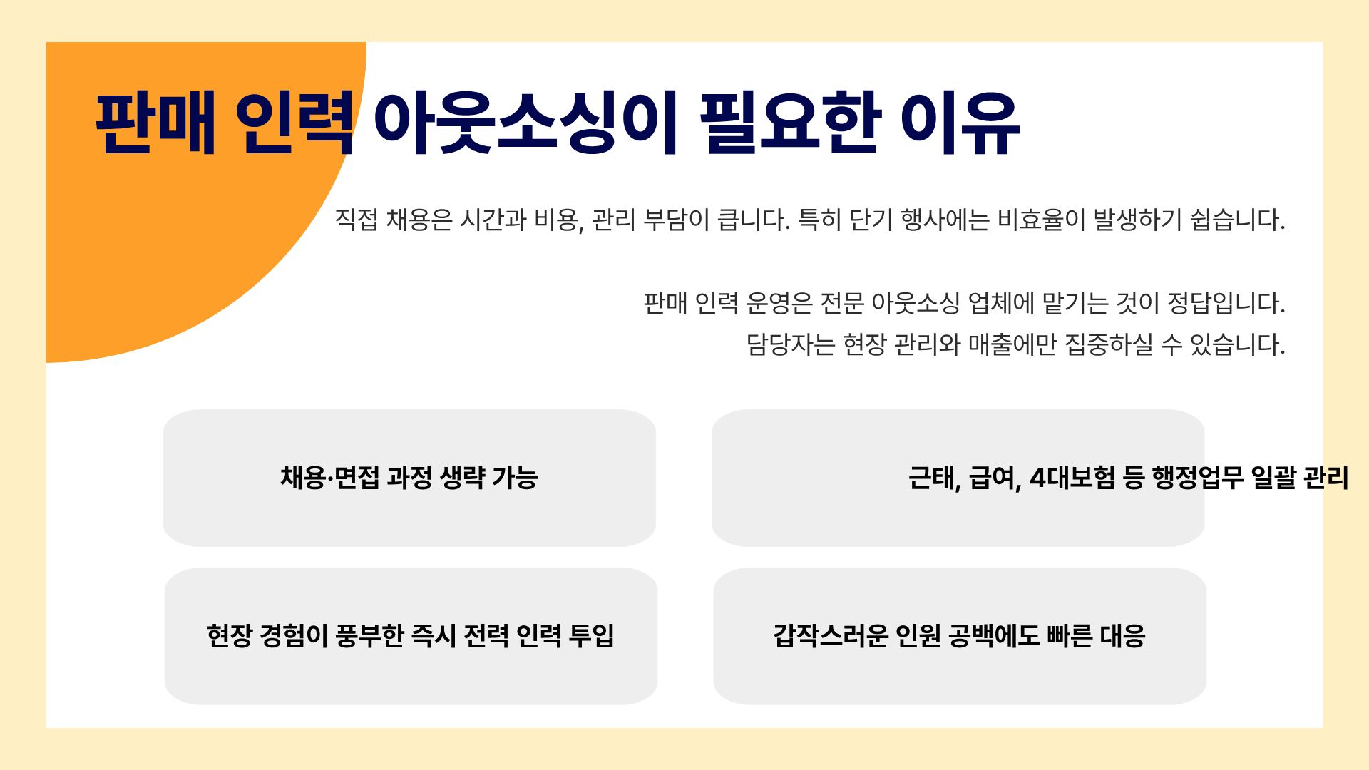판매 인력 운영은 전문 아웃소싱 업체에 맡기는 것이 정답입니다.