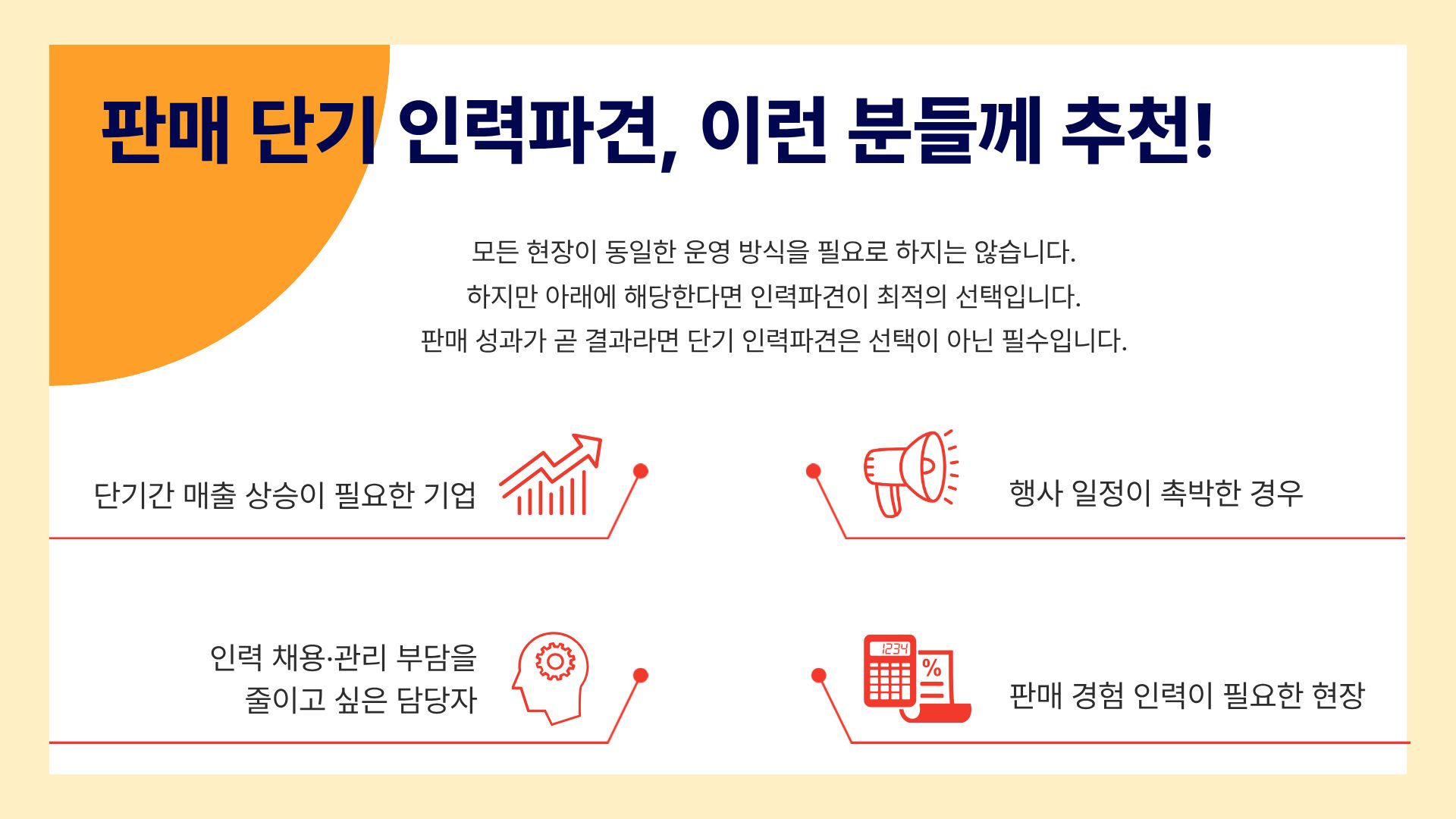 판매 성과가 곧 결과라면 단기 인력파견은 선택이 아닌 필수입니다.